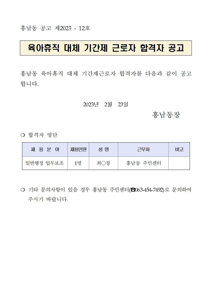 | 306 | 흥남동 기간제근로자 합격자 공고 |