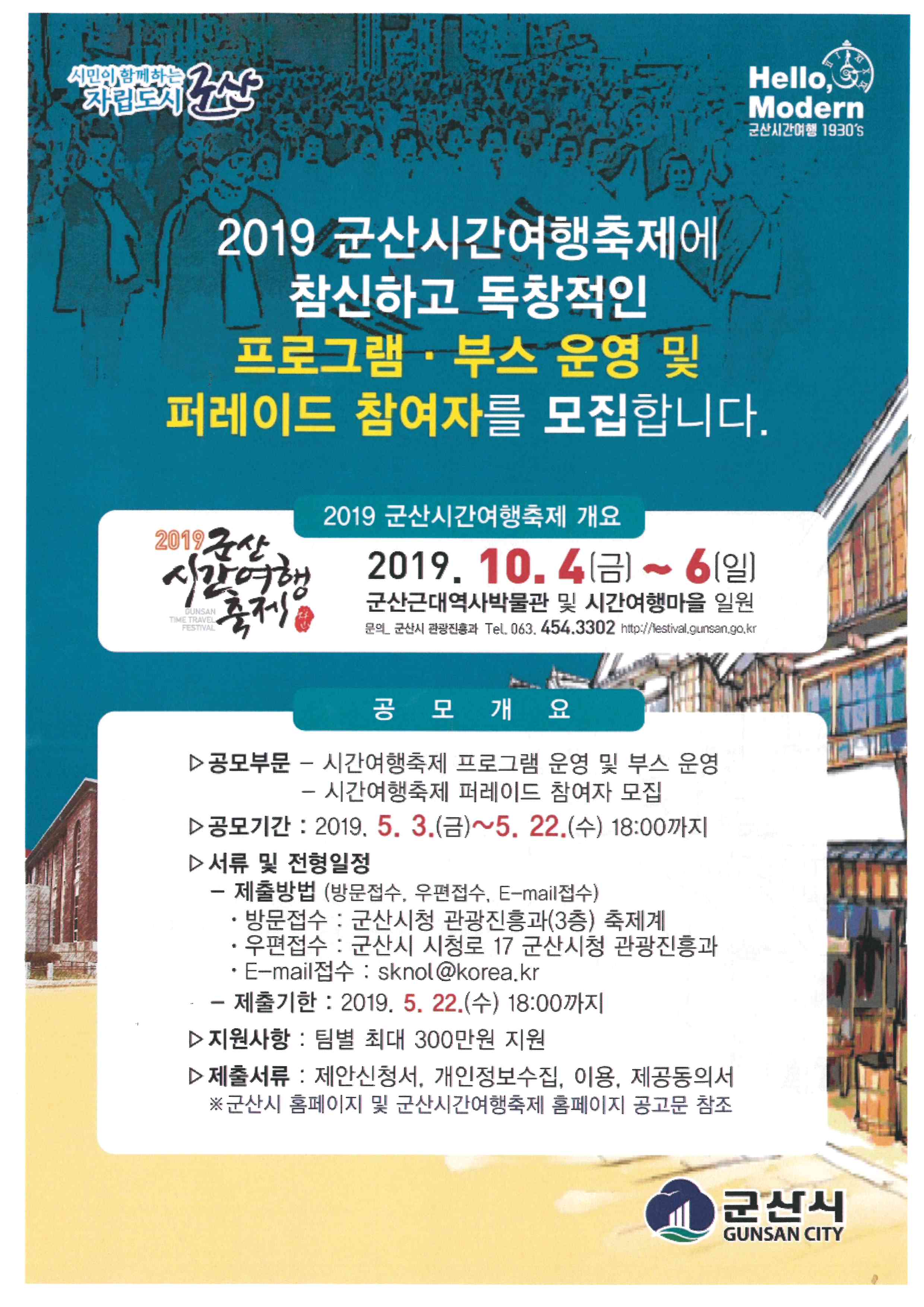 | 63 | 2019 군산시간여행축제 프로그램 등 제안공모 안내 |