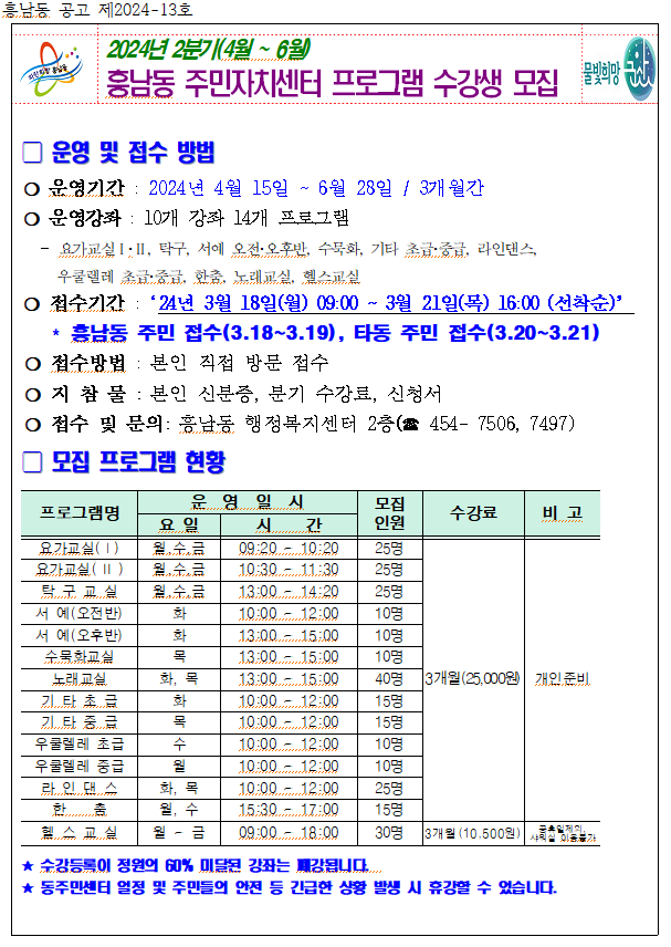 | 347 | 2024년 2분기 흥남동 주민자치센터 프로그램 수강생 모집 공고 |