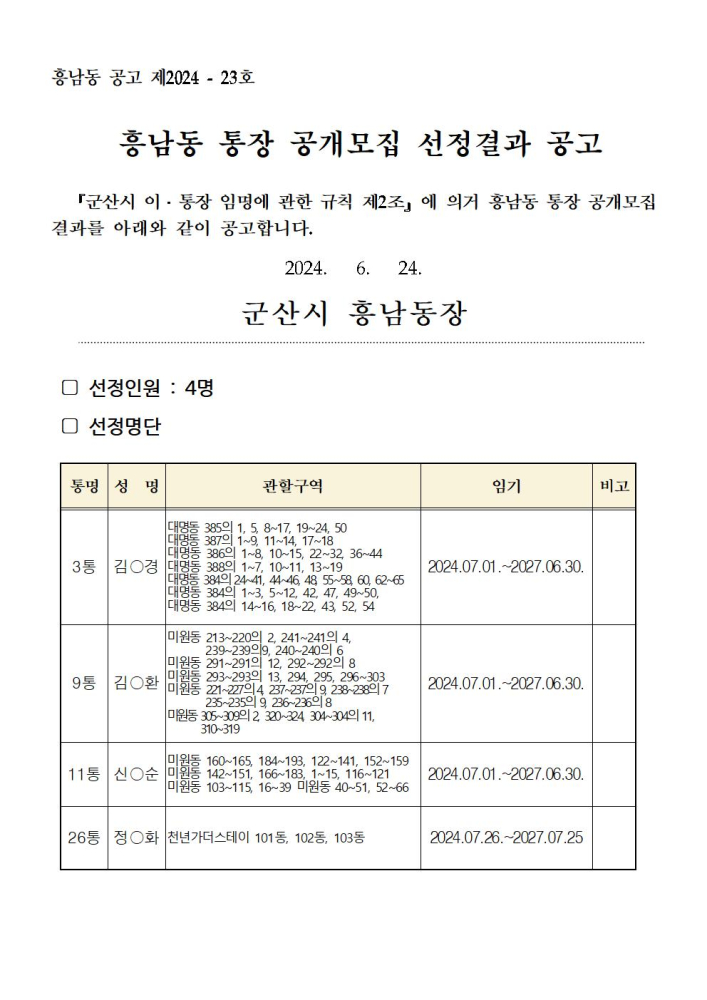 | 351 | 흥남동 통장 공개모집 선정결과 공고(3통, 9통, 11통, 26통) |