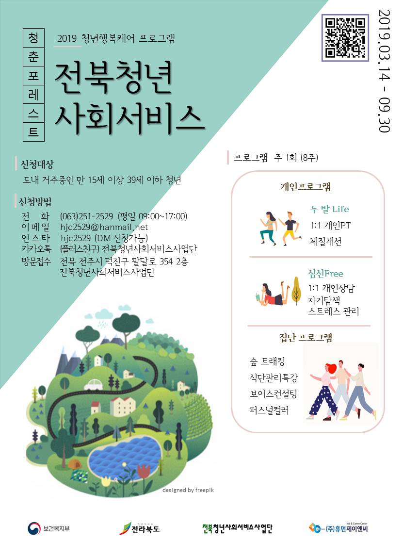 지역 청년이 주체가 되어 청년수요에 맞는 사회서비스 개발.제공 일환으로 청년층의 건강개선 및 청년 일자리 창출을 위해 전북청년사회서비스사업단에서 운영하는 "2019 청년행복케어 프로그램"을 붙임과 같이 운영하오니 관내 거주중인 만15세이상 39세이하 청년들의 많은 관심바랍니다.