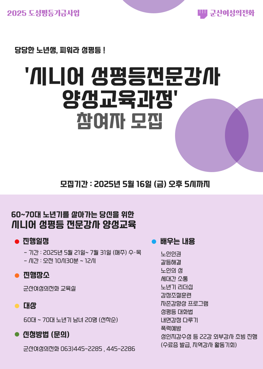 | 8421 | 시니어 성평등전문강사 양성교육과정 참여자 모집 |