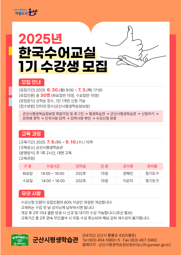 | 309 | 2025년 군산시평생학습관 한국수어교실 1기 수강생 모집 |