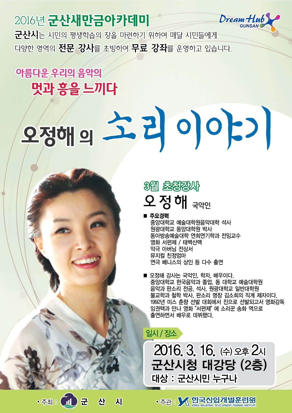 | 3355 | (군산새만금아카데미 무료강좌)국악인 오정해 교수의 소리이야기 |