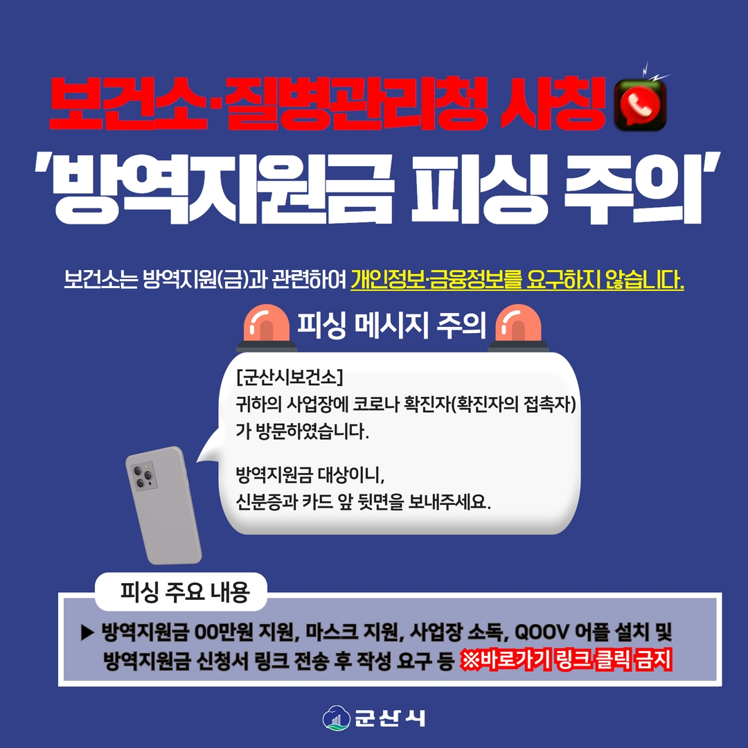 방역지원금 00만원 지원, 마스크 무료제공, 사업장 소독 지원 등의 내용으로 피싱사례가 발생하고 있습니다.