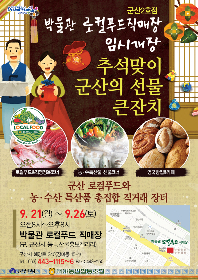 군산시 농민들의 염원을 담아 지난해 개장한 옥산농협 로컬푸드직매장(군산1호점)에 이어 대야농협『박물관 로컬푸드직매장(군산2호점)』이 아래와 같이 임시개장하게 되어 알리오니 많은 방문 바랍니다.
