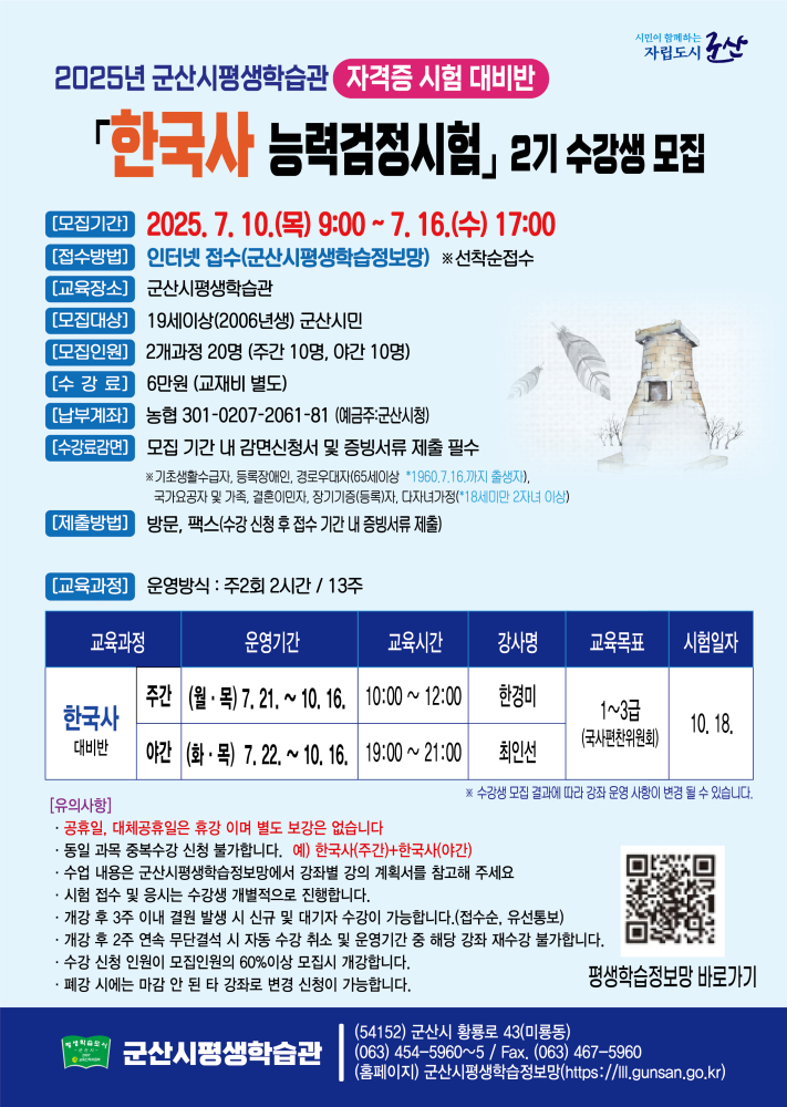 | 311 | 2025년 한국사능력검정시험2기 자격증 시험 대비반 수강생 모집 |
