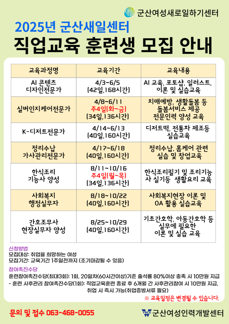 | 291 | 군산여성새로일하기센터 2025년 새일센터 직업교육 훈련생 모집 |