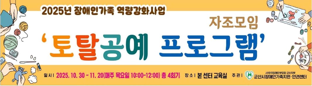 군산시장애인가족지원·인권센터에서는 자조모임을 통해 가족들의 여가시간을 활용한 자기개발 기회를 제공하고, 부모님들간의 교류를 통한 정보교환, 상호지지, 공감대 형성, 삶의 질 향상을 목적으로 '토탈공예 프로그램'을 다음과 같이 실시하오니 많은 참여 바랍니다.