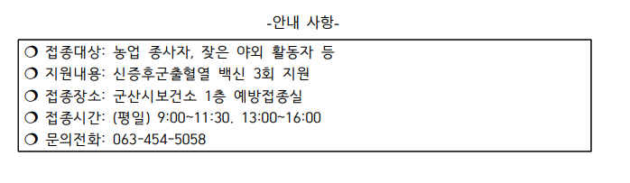 | 587 | 농업종사자 등 신증후군(유행성)출혈열 예방접종 안내 |