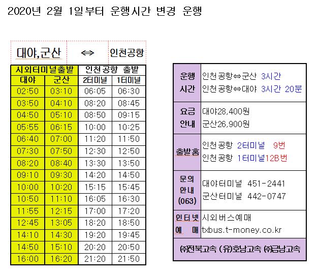 군산-인천공항, 대야-인천공항 운행시간이