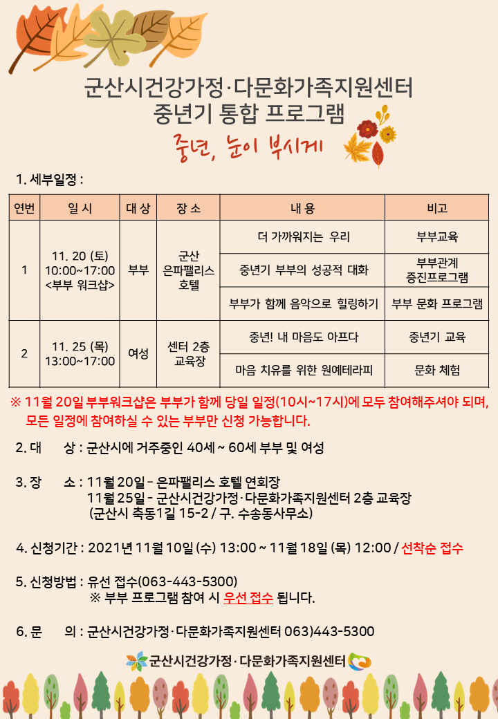| 174 | (군산시 건강가정다문화가족지원센터) 중년기 통합 프로그램 홍보 및 참여신청 안내 |