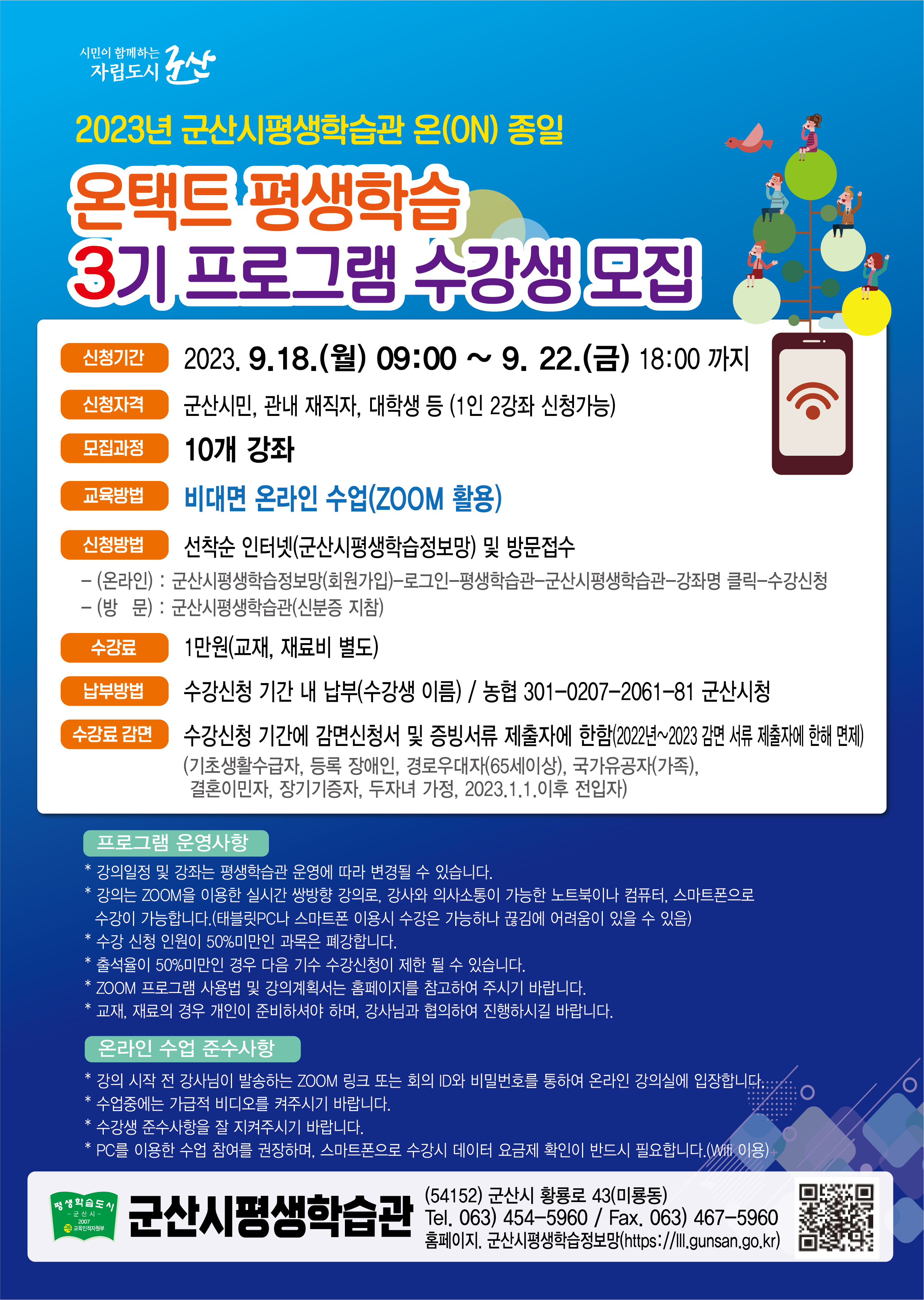 ○ 신청기간 : 2023. 9. 18.(월) 09:00 ~ 9. 22.(금) 18:00○ 신청자격 : 군산시민, 관내 재직자, 대학생 등 (1인 2강좌 신청가능)