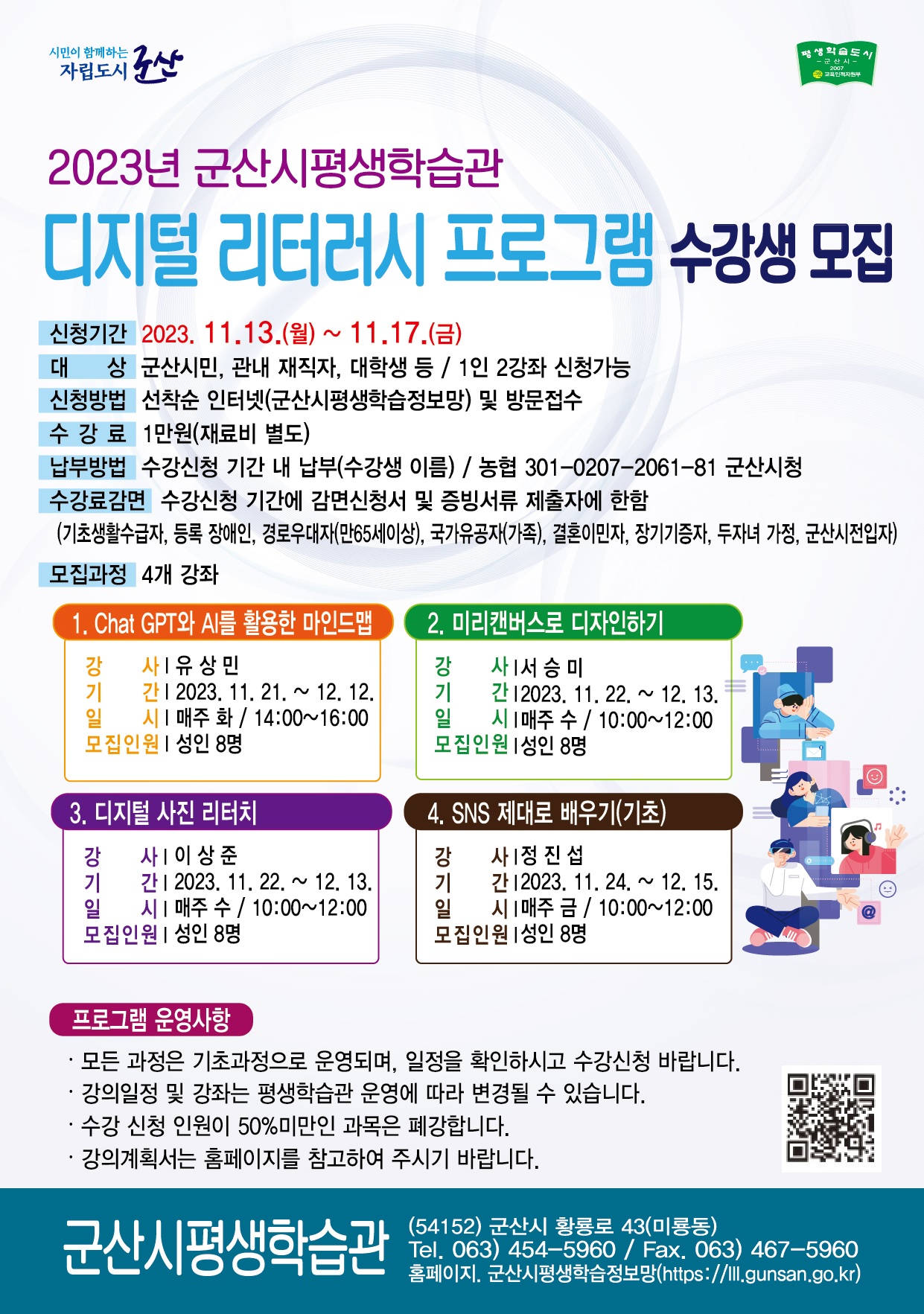 ○ 모집강좌 : 4개 강좌(Chat GPT와 AI를 활용한 마인드맵, 미리캔버스로 디자인하기, 디지털 사진 리터치, SNS제대로 배우기)