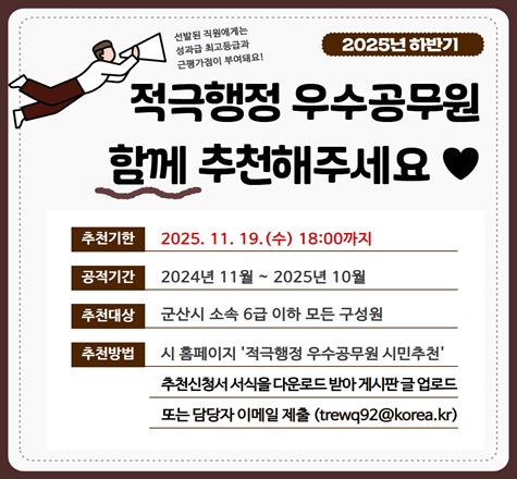 군산시 인사위원회 공고 제2025–25호 2025년 제9회 군산시 지방임기제공무원 채용계획 공고 군산시에서 근무할 지방임기제공무원을 다음과 같이 채용하고자 합니다. 2025년 10월 30일군산시 인사위원회 위원장