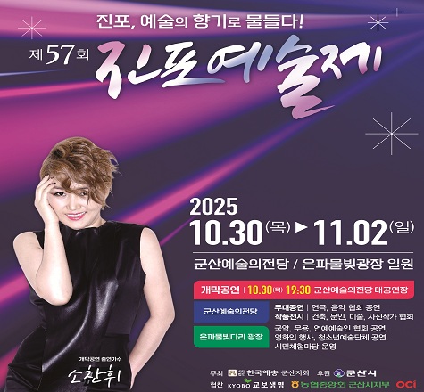 2025년 제57회 진포예술제 행사 안내2025년 제57회 진포예술제가 2025.10.30.(목)부터 11.2.(일)까지 4일간 개최됩니다.연극, 음악 등의 다양한 공연과 문인, 미술, 사진, 건축 등 화려한 전시 행사가 있으니 많은 참여 바랍니다.특히 개막 당일인 10월2025.10.27