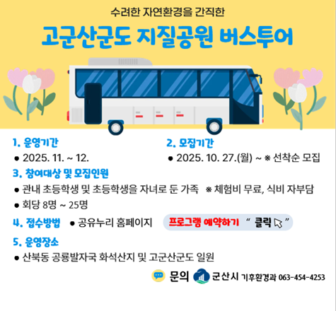 [군산시 농어촌종합지원센터] 2025년 하반기 마을리더역량강화 교육생 모집 안내○ 교 육 명 : <하반기>마을리더역량강화교육○ 모집대상 : 마을발전 및 공동체 활성화를 위해 기초단계 진입을 희망하는 군산시 읍면 마을 주민 30명○ 교육장소 : 군산시 옥산면 힐빙센터 2층 세미나실 ○ 신청방법 : 공고2025.10.17