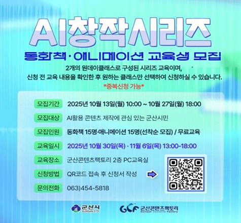 군산콘텐츠팩토리 [내 목소리로 만드는 오디오북] 교육 수강생 모집군산콘텐츠팩토리에서 성인을 대상으로 한 오디오북 제작 교육이 진행됩니다.이번 교육에서는 직접 책을 낭독하며 음향스튜디오에서 녹음을 하고, 녹음한 파일을 스스로 편집해보는 과정을 체험할 수 있습니다. 독서의 계절 가을, 목소리로 책을2025.09.08