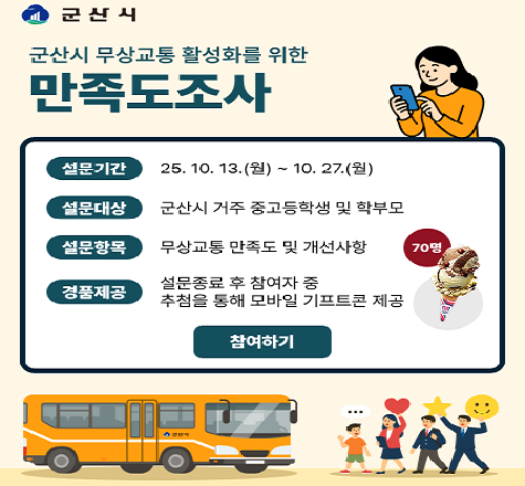 2025년 10월 어린이 숲체험교실 참여가족 모집「군산시 어린이 숲체험교실(10월) 가족체험 참가자 모집」- 모집기간: 10/1(수) 09:00 ~ 마감시까지- 운영일자: 10/11(토), 10/18(토) 중 택1- 운영시간: 10:00~11:30- 참가대상: 5세~초2 아동이 있2025.09.30
