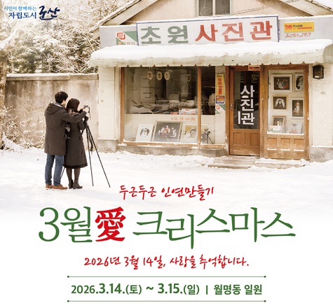 두근두근 인연만들기 [3월愛 크리스마스] 참가자 모집 안내군산시에서는 바쁜 일상 속 미혼남녀의 자연스러운 소통과 교류의 장을 마련하여 연애·결혼에 대한 긍정적 인식을 제고하고 결혼 친화적 분위기 조성을 위해 군산시 두근두근 인연만들기 [3월 愛 크리스마스] 참가자를 모집하오니 많은 관심과2026.01.26