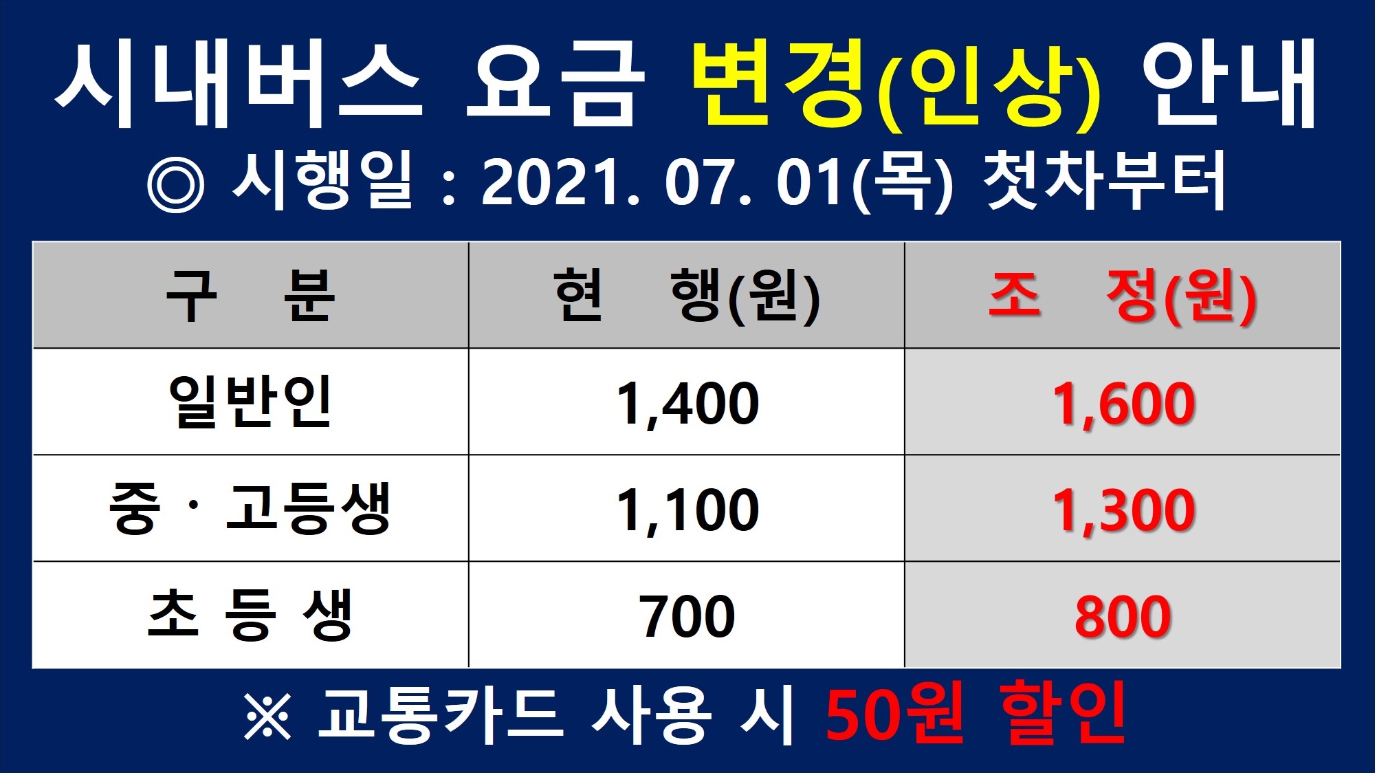 군산 시내버스 운임요금이 전라북도 소비자정책심의위원회에서 요금 인상 기준이 확정됨에 따라 4년 만에 2021. 7. 1.(목)부터 인상됨을 공지하오니 참조하시기 바랍니다.