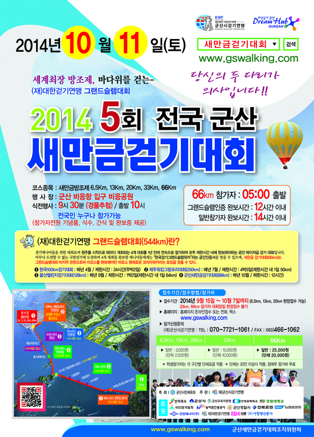 2014 전국 군산 새만금걷기대회가 오는 10월 11일(토)에 새만금 방조제 일원에서 개최됩니다.