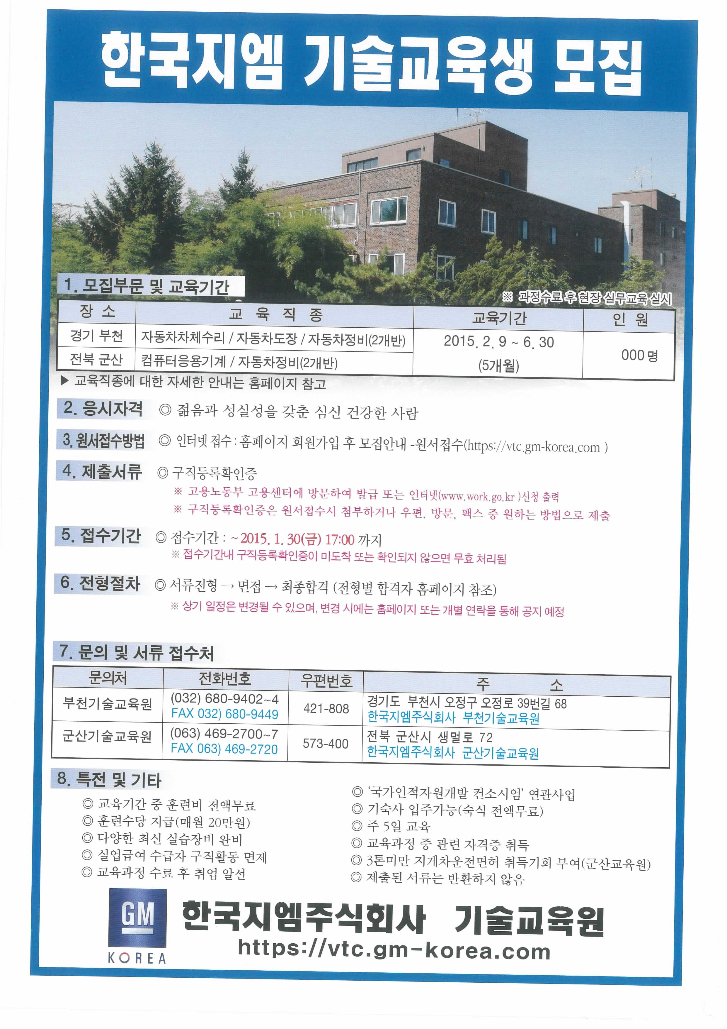 한국지엠주식회사에서는 2015년도 상반기 기술교육생을 붙임 안내문과 같이 모집한다하오니