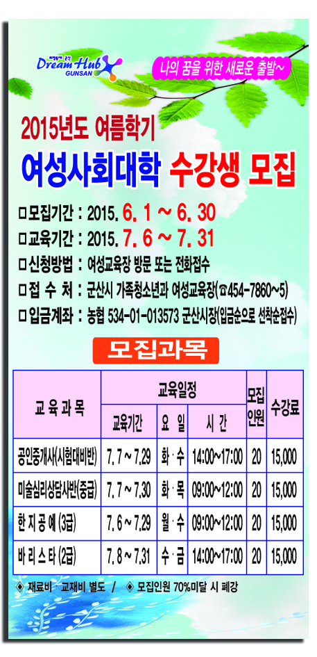 접 수 처 : 군산시 가족청소년과 여성교육계 ( 454-7860 ~ 5)