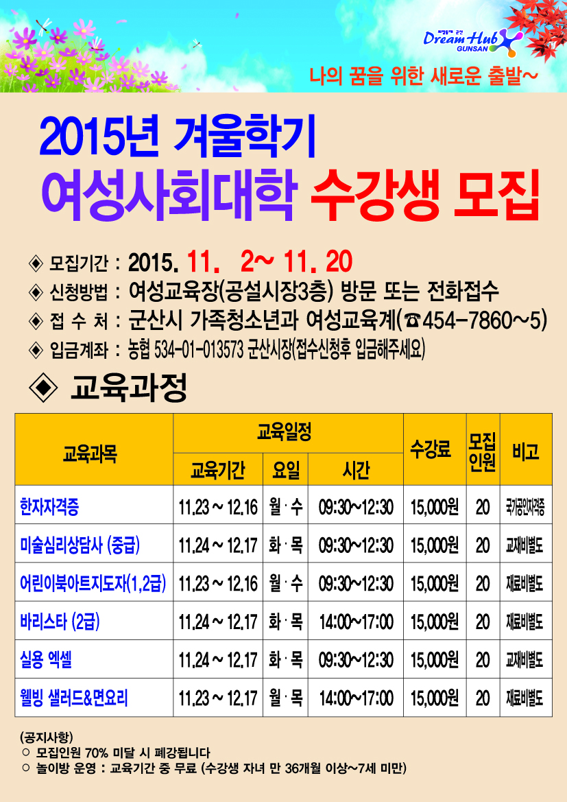 2015년 겨울학기 여성사회대학 수강생을 다음과 같이 모집하오니 시민 여러분들의 많은 참여 부탁드립니다.