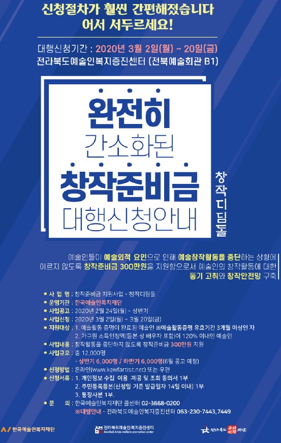 o 문의 및 신청대행 : 전라북도문화관광재단 예술인복지증진센터 (063-230-7443,7449)