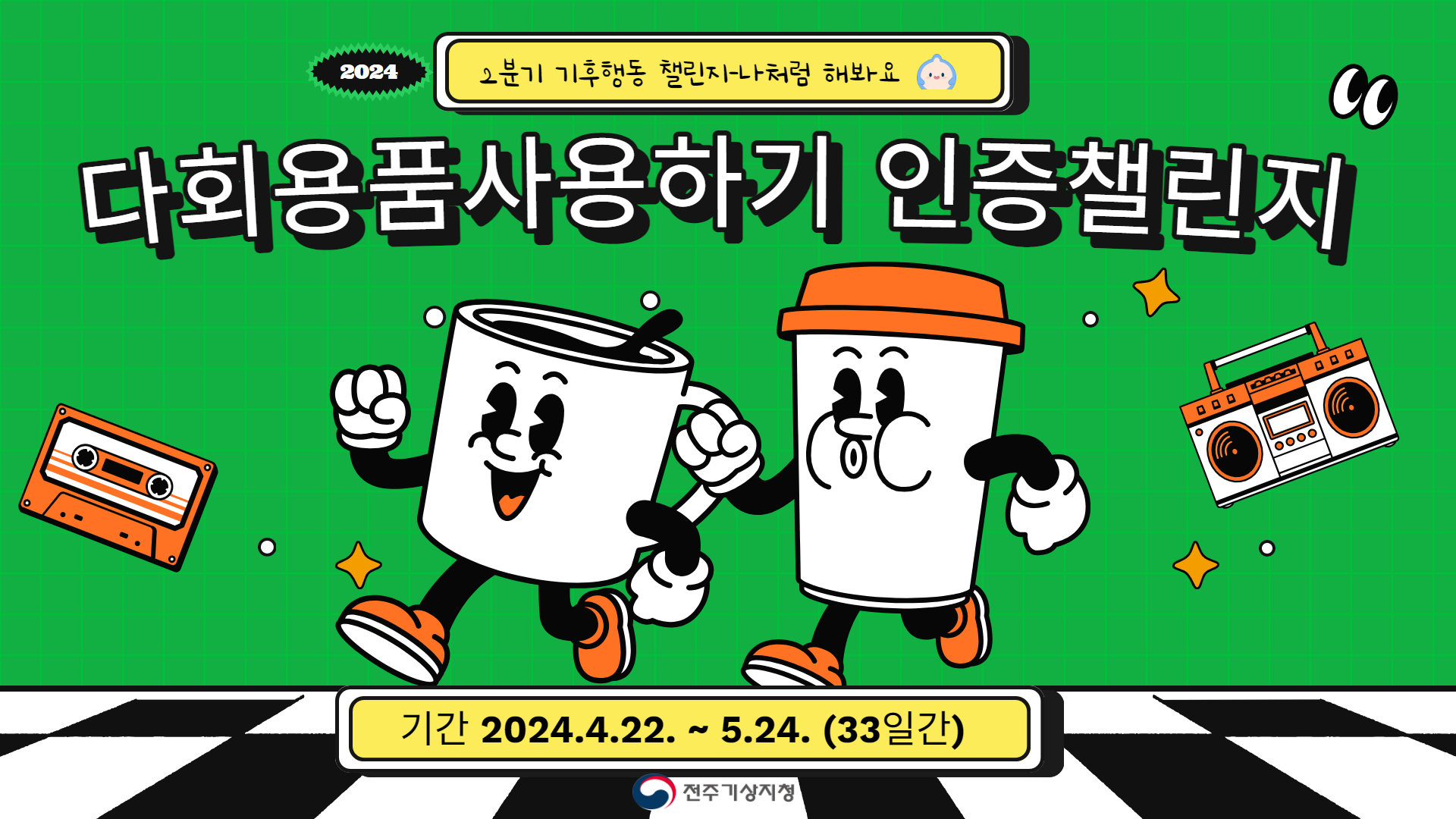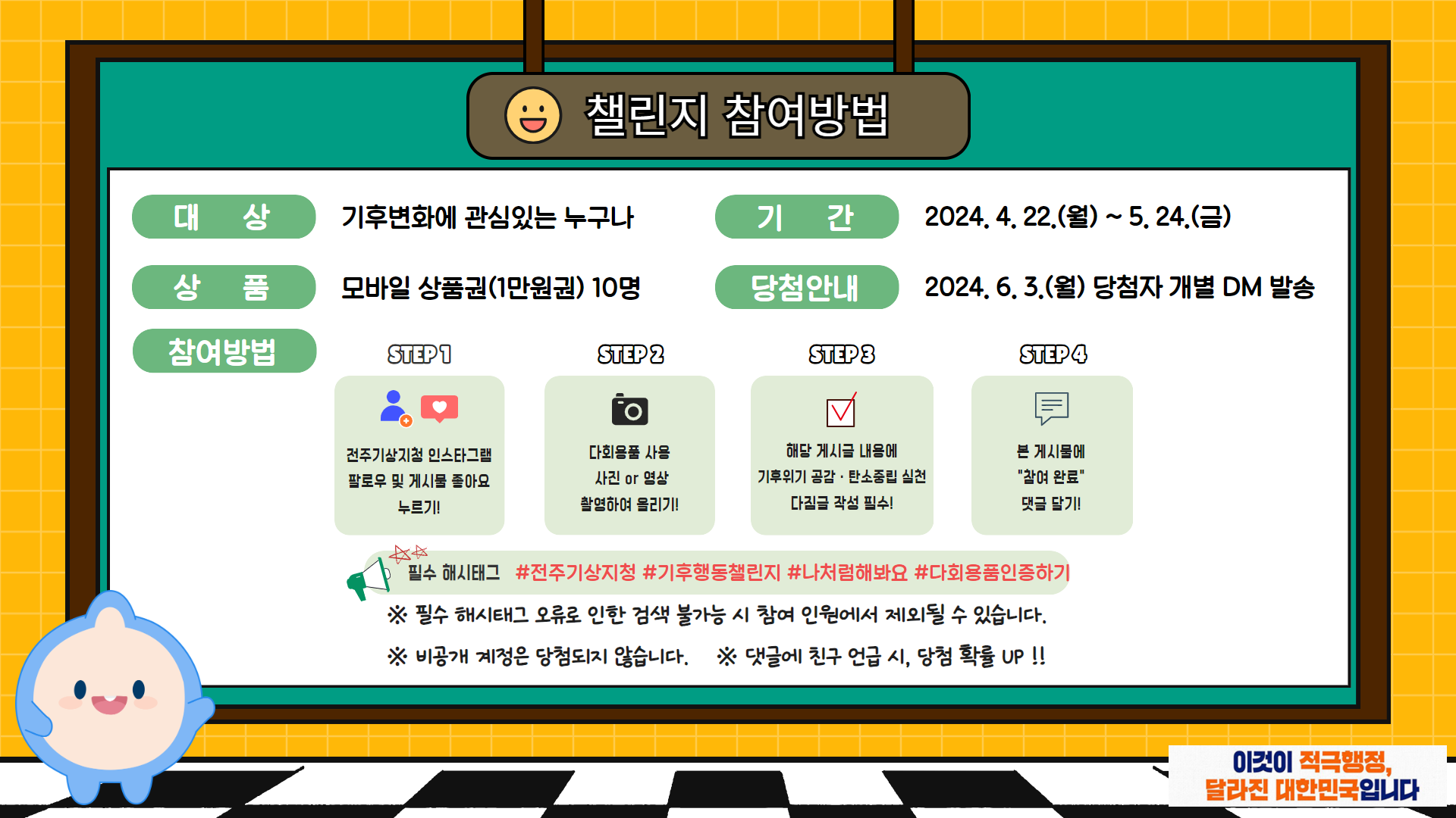 전주기상지청에서 기후위기 인식 확산 및 생활 속 탄소중립 실천문화 조성을 위해 '기후행동 챌린지' 참여프로그램을 붙임과 같이 운영하오니, 많은 시민들의 참여를 바랍니다.