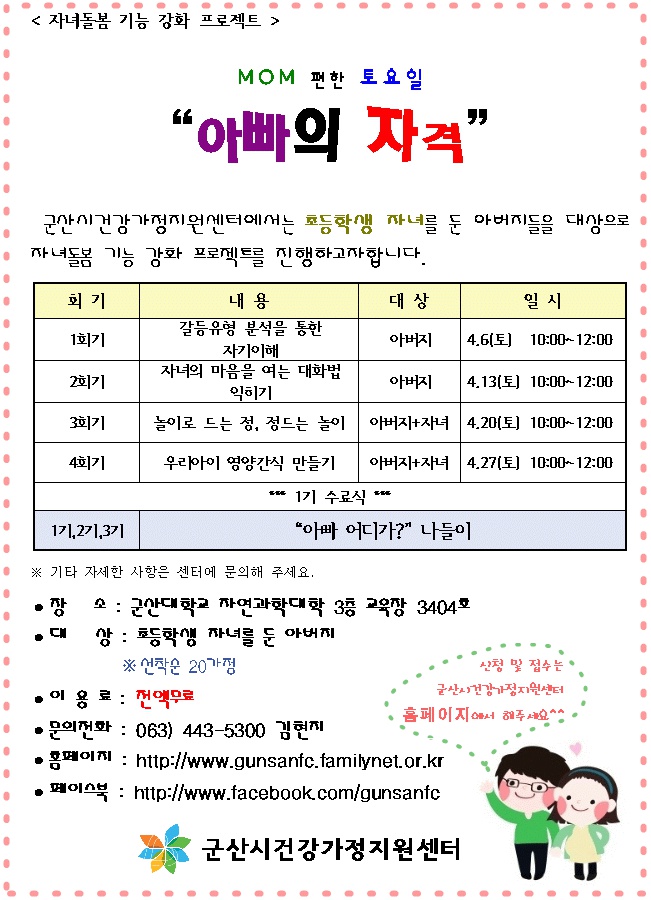 군산시 건강가정지원센터에서 초등학생 자녀를 둔 아버지들을 대상으로 자녀돌봄 기능강화 프로젝트를 진행합니다.