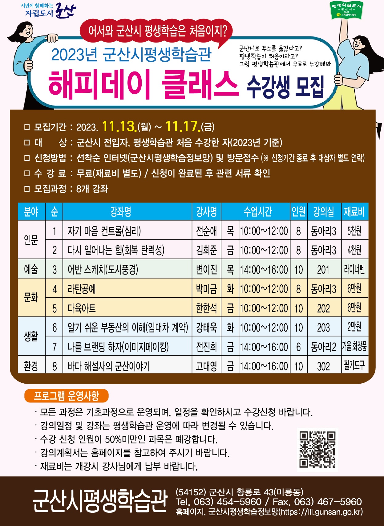 ○ 대 상 : 군산시 전입자, 평생학습관 처음 수강한 자