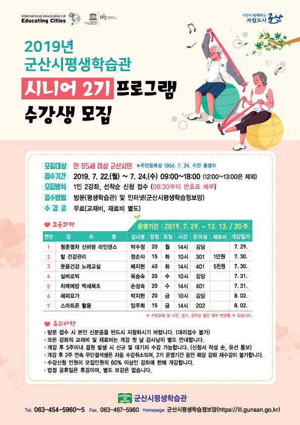 군산시평생학습관에서는 100세 시대 행복한 노년기를 누리기 위한 시니어 2기 프로그램 수강생을 다음과 같이 모집합니다.