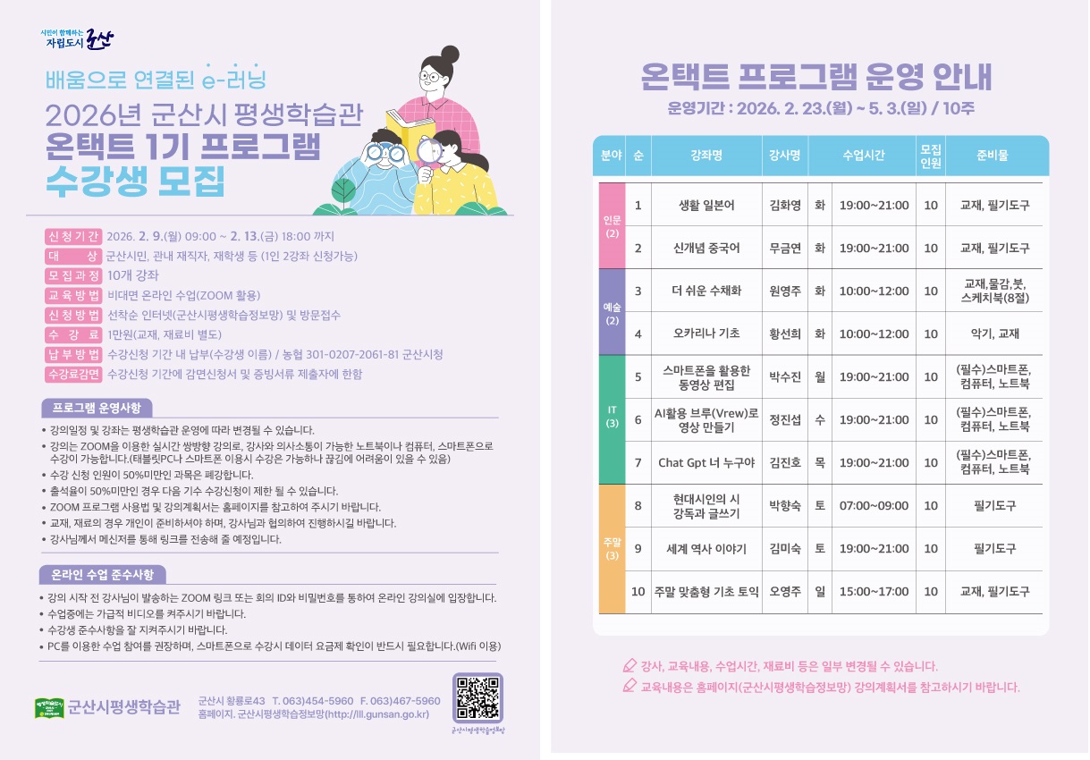 2026년 군산시평생학습관 온택트 1기 프로그램 수강생 모집