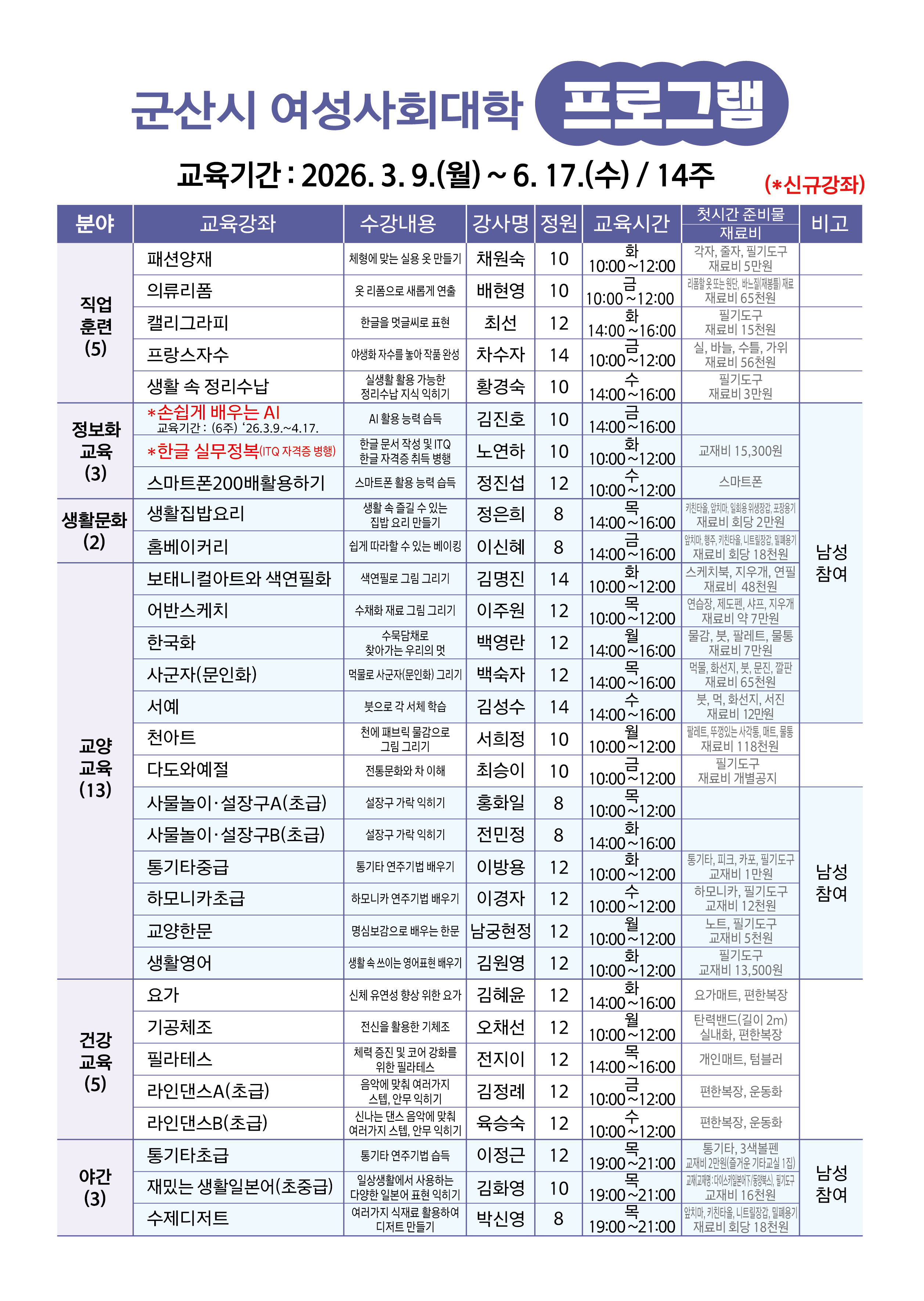 2. 모집대상 : 군산시 여성 및 일부강좌 남성 참여(19강좌)