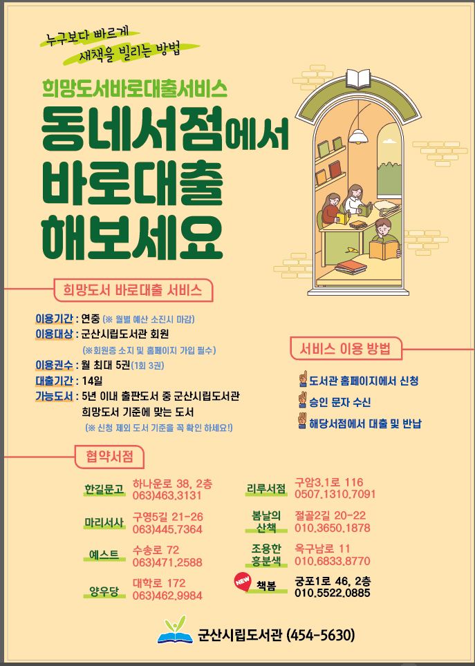 군산시립도서관에서는 시민이 원하는 도서를 도서관 홈페이지에서 신청하고 서점에서 새 책으로 바로 대출하여 읽을 수 있는 희망도서바로대출서비스를 실시하고 있으며, 2024년 3월부터는 대상서점을 7개소에서 8개소로 확대하여 운영하오니, 관심 있는 군산 시민이 서비스를 이용할 수 있도록 널리 홍보하여 주시기 바랍니다.