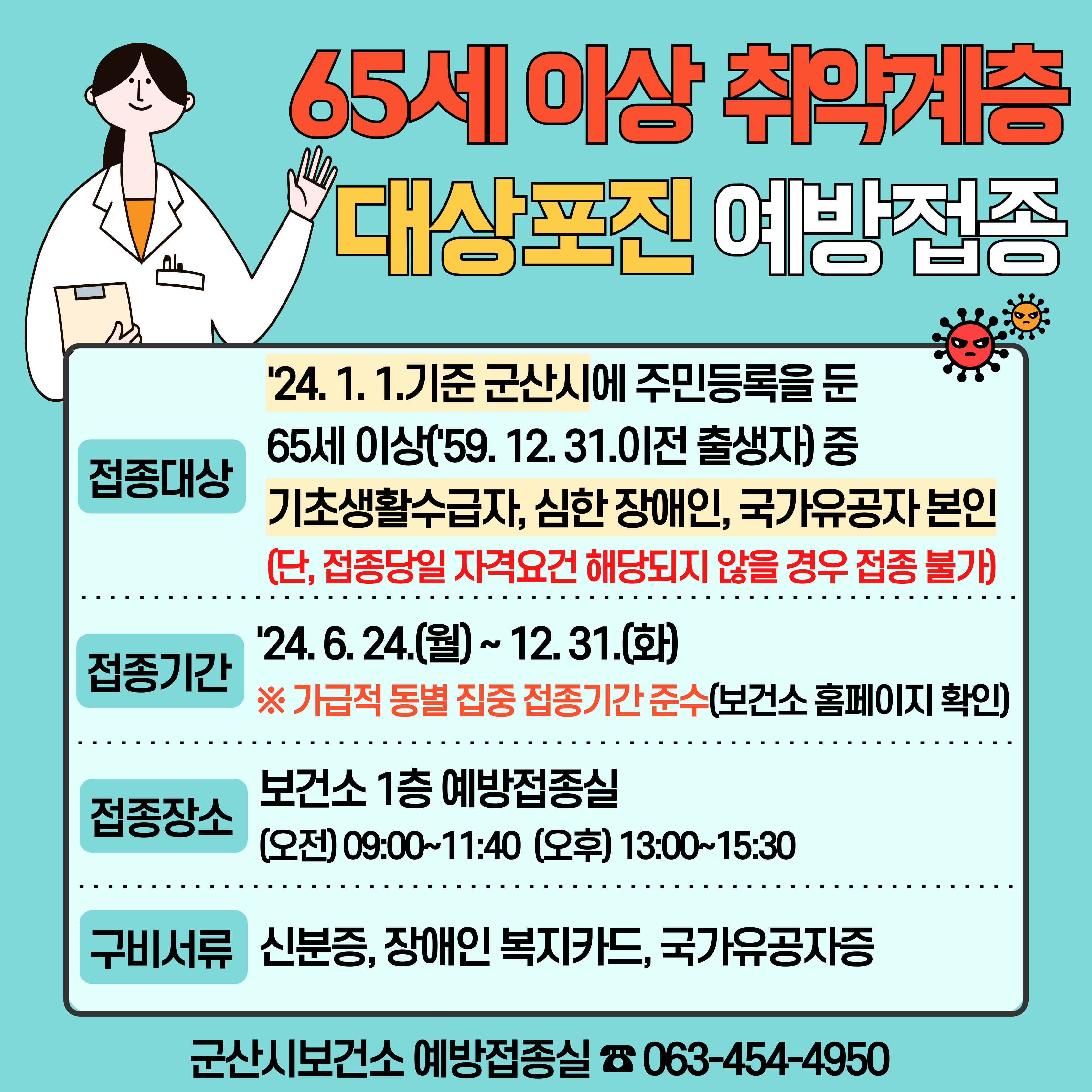 다. 신청대상 : `24.1.1. 기준 65세 군산시민 중 기초생활수급자, 심한 장애인, 국가유공자 본인