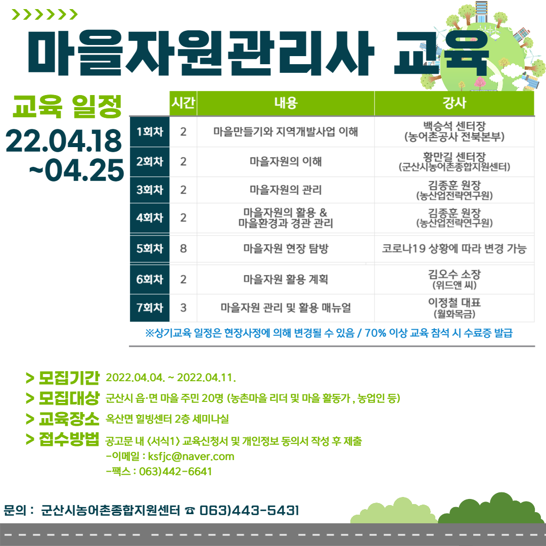 군산시농어촌종합지원센터에서는 군산시 농촌지역 인적자원육성을 위한 「마을자원관리사」교육생을 아래와 같이 모집합니다.