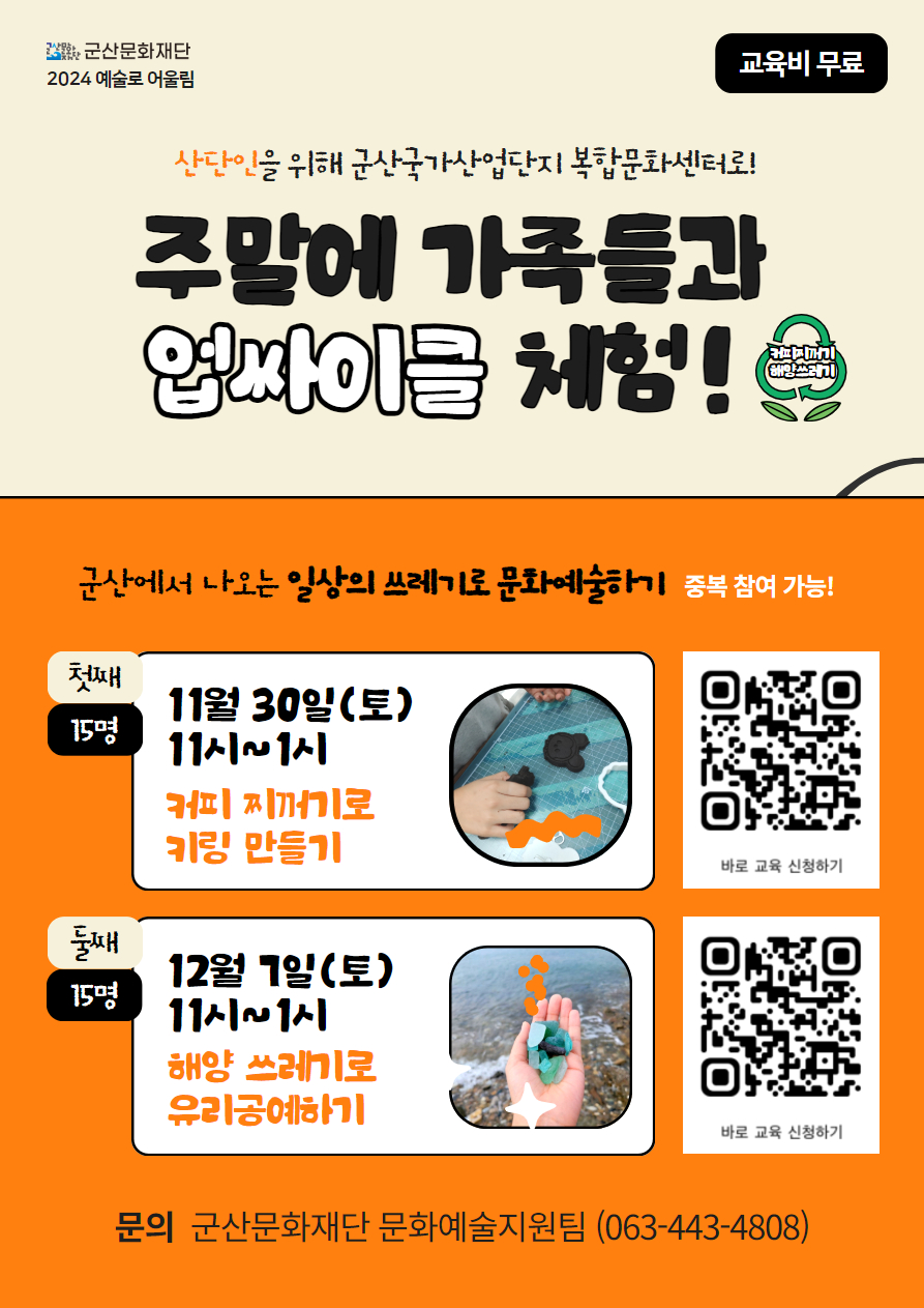 재단법인 군산문화재단에서 업싸이클 문화예술교육과 체험을 경험하고 싶은 군산산업단지 근로자 가족을 찾습니다. 11월 30일과 12월 7일 매주 토요일에 찾아가겠습니다!