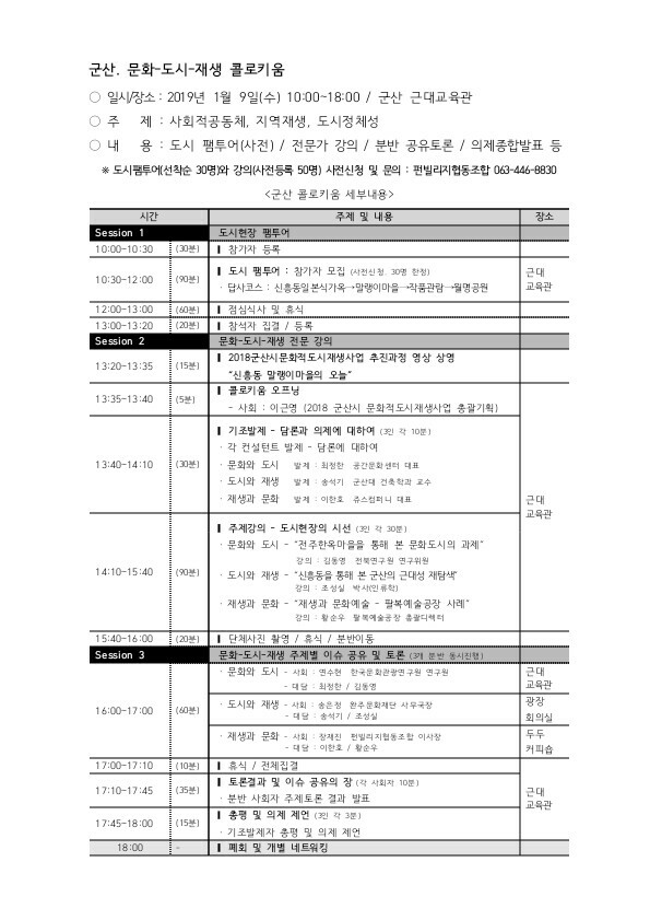 2019년 군산 문화, 도시, 재생 콜로키움을 개최하고자 하오니 많은 참석 바랍니다.