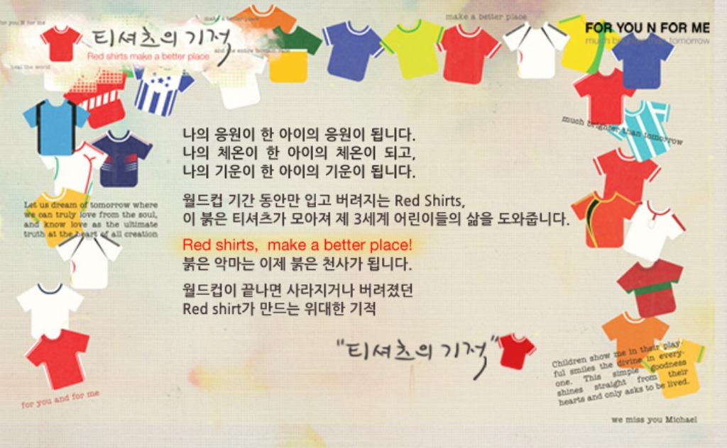 월드컵은 끝났지만 월드컵의 기적은 지금 시작되었습니다. 바로 '티셔츠의 기적'입니다. 열정적으로 응원하기 위해 입었던 붉은 티셔츠를 기부하여 이제 막 겨울이 시작된 아프리카의 아이들을 지켜주자는 바로 기부운동입니다. 지금 전국 곳곳에서 '티셔츠의 기적'을 만들고 있습니다.
