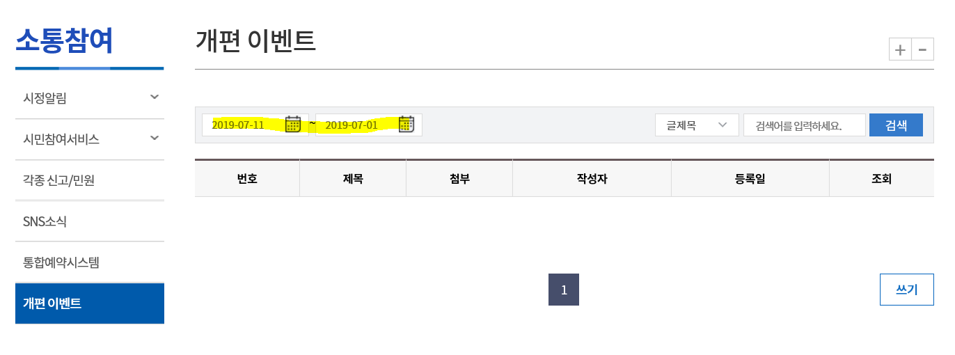 | 46 | 게시판 날짜(기간)검색 오류 | 하문희 | 19.07.11 | 178 | |