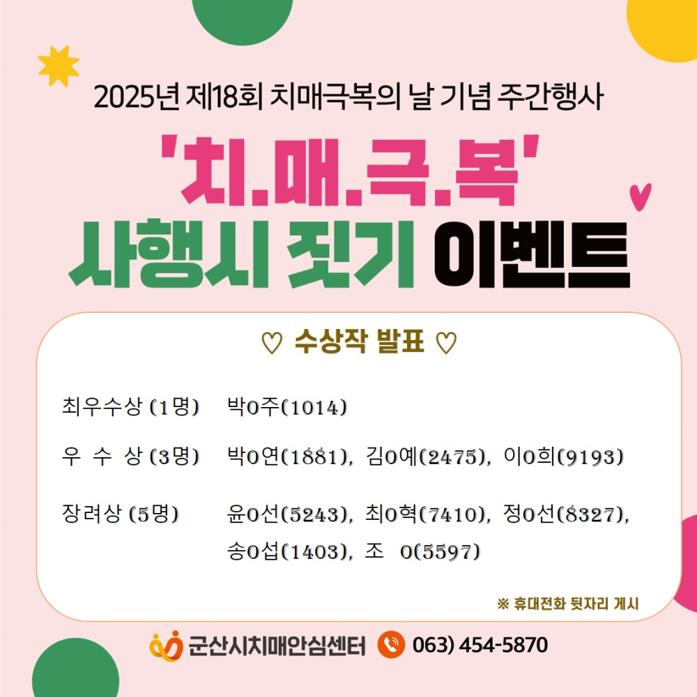 881 「2025년 치매극복 주간행사」 '치매극복' 사행시 짓기 이벤트 결과 발표 다운받기 건강관리과 25.09.11 2299