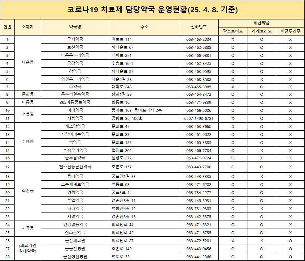 군산시 코로나19 치료제 담당약국 운영현황 안내드립니다.