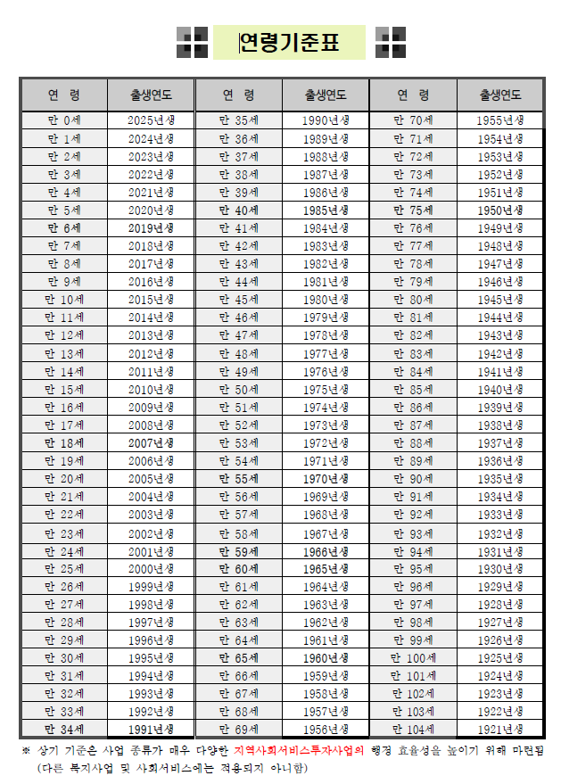 | 68 | 2025년 지역사회서비스 투자사업 연령기준표(만나이/년기준) |