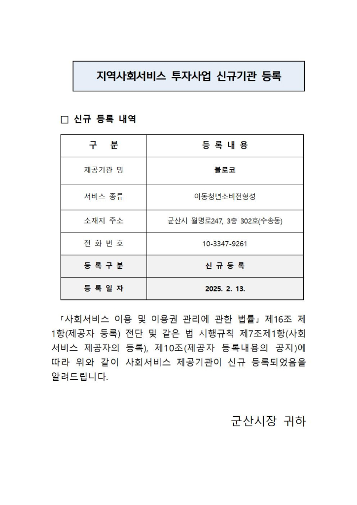 | 70 | 지역사회서비스 투자사업 사회서비스 제공자 신규등록 사항 알림 |