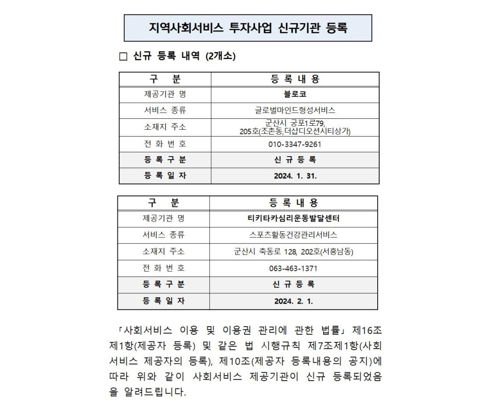 | 48 | 지역사회서비스 투자사업 사회서비스 제공자 신규등록 사항 알림(2024년 1차) |
