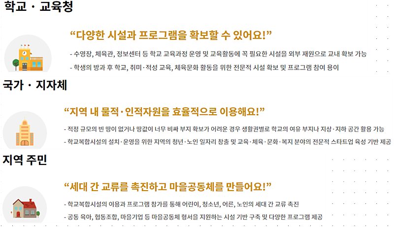 교육부에서 지역 발전을 위해 향후 5년간 약 200여개의 학교복합시설을 설치할 계획이라고 합니다