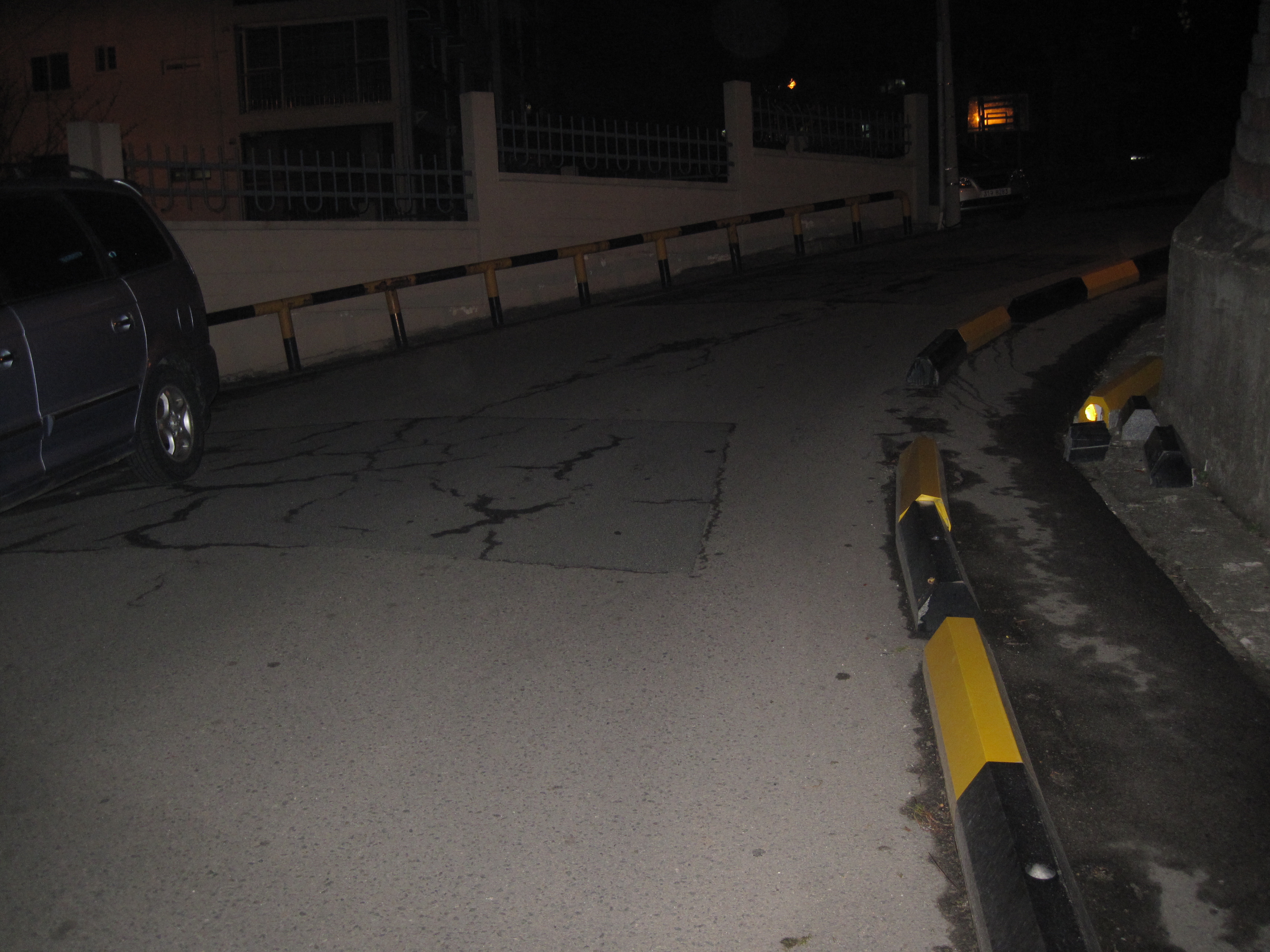 이용하던 중 연립주택 담 옆으로 빽빽하게 주차된 차들을 피해 오르막길 코너를 지나다가